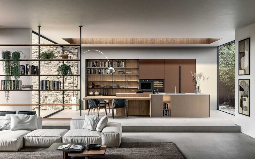 Cucine, anche su misura, con isola o penisola, aiutano a dividere l’ambiente in modo naturale e armonioso. Questi elementi, oltre a suddividere idealmente la cucina dal soggiorno, fungono anche da luogo di aggregazione. Chi cucina non è isolato dalla famiglia e gli ospiti possono muoversi liberamente nello spazio di convivialità.